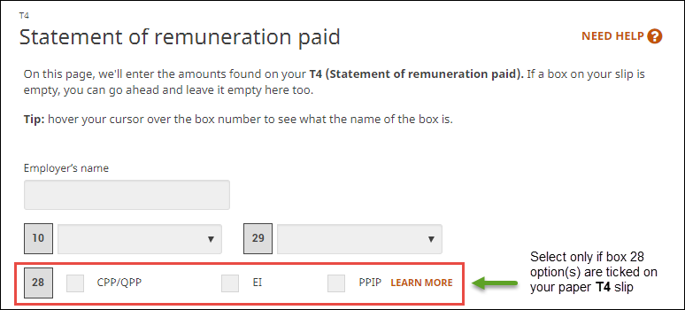 When you enter information from your paper T4 slip into H&R Block’s tax software, be sure to select an option for box 28 only if an X appears in the CPP/QPP, EI, or PPIP box of your paper T4 slip.
